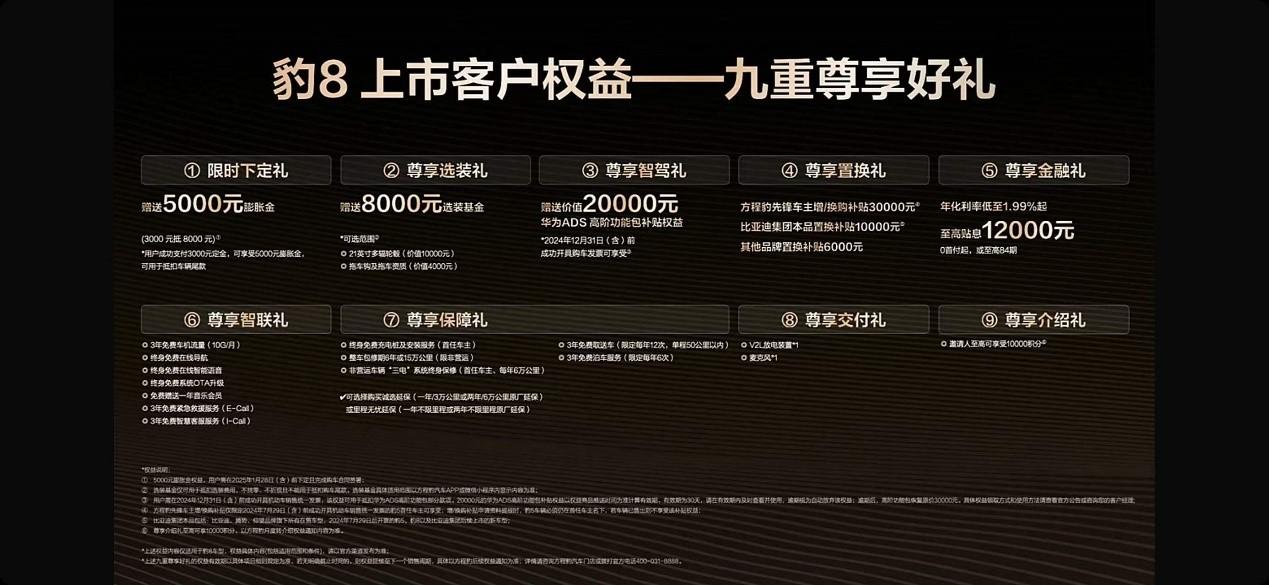 方程豹豹8共提供四款配置,它有6座版和7座版可選擇,7座版采用的是2+3+2的座椅布局,6座版采用的是2+2+2的座椅布局,6座版車型的第二排采用兩個獨立的座椅,它的空間合理性堪比MPV車型,日常帶娃或者讓老年人乘坐都非常的合適。此外,方程豹豹8還有一系列的上市政策,包括3000元抵8000元的限時下定禮、送8000元選裝基金的選裝禮、價值20000元的智駕禮、置換禮、金融禮、智聯禮、保障禮、交付禮和介紹禮,共九重好禮。