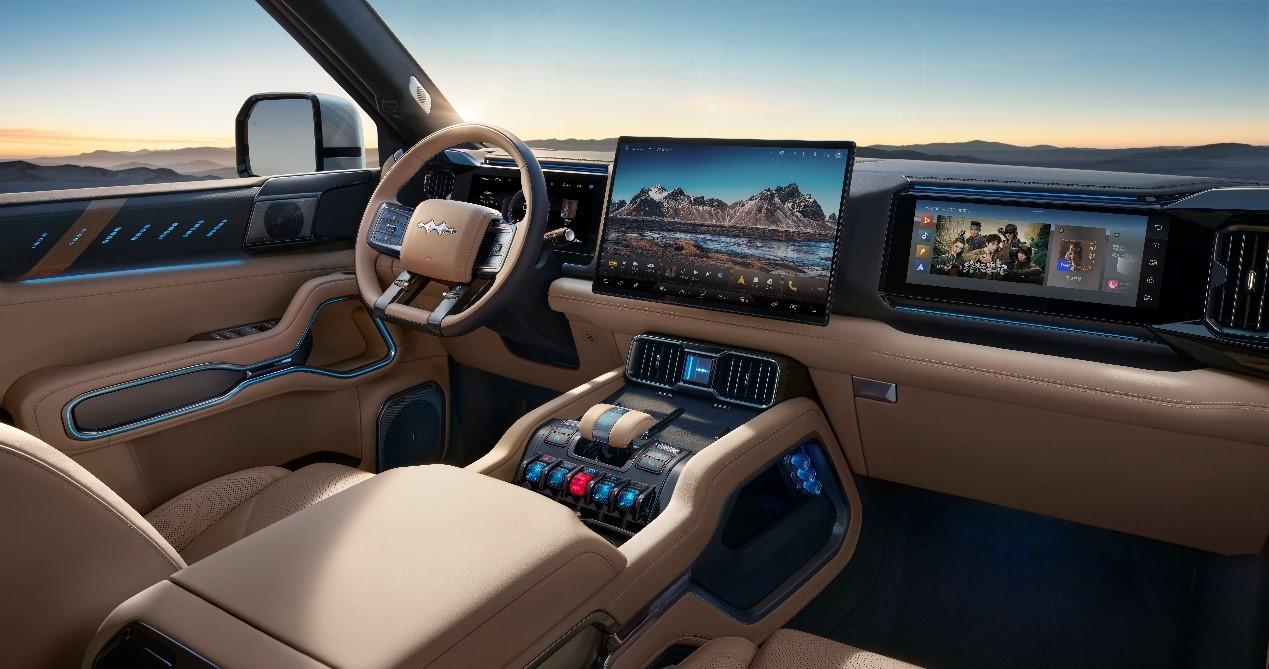 豹8還配備硬派專屬AI智能座艙,采用4nm先進制程的BYD 9000芯片,融合AI大模型的智能語音和智能影像等能力,擁有先進的人機交互體驗,而且座艙內冰箱、彩電、大沙發一應俱全。從方程豹豹8的整體表現來看,它堪當國貨旗艦。