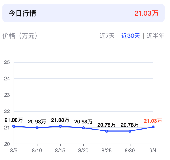 接下來看看近期的行情變化趨勢,我們以銷量較高的23款 245km 超長續航Halo車型作為例子。今天這款車的行情為21.03萬元,在近30天里面,這個行情價格其實是一個高位。這個其實不難理解,畢竟新款車型已經上市,23款車型庫存越來也少,相信也很難在回歸到更低的行情,想買到底價的舊款車型,就要看緣分了。如果確實喜歡領克08 EM-P,恐怕要把目標放在25款車型上。