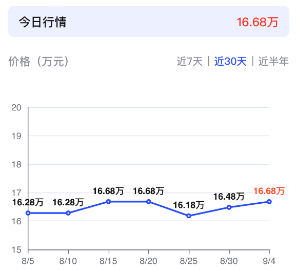 接下來是價格趨勢了,我們以主力車型-指導價19.98萬元的雙擎 2.0HG尊貴版作為例子。今天這個車型的行情價為16.68萬元,回顧近30天的行情變化,最低點曾經低至16.18萬元,目前這款車的行情價格是近30天以來的高位。如果你近幾天想入手凱美瑞這款車的,我建議是觀望一下價格,這臺車的優惠力度可能正在收縮。