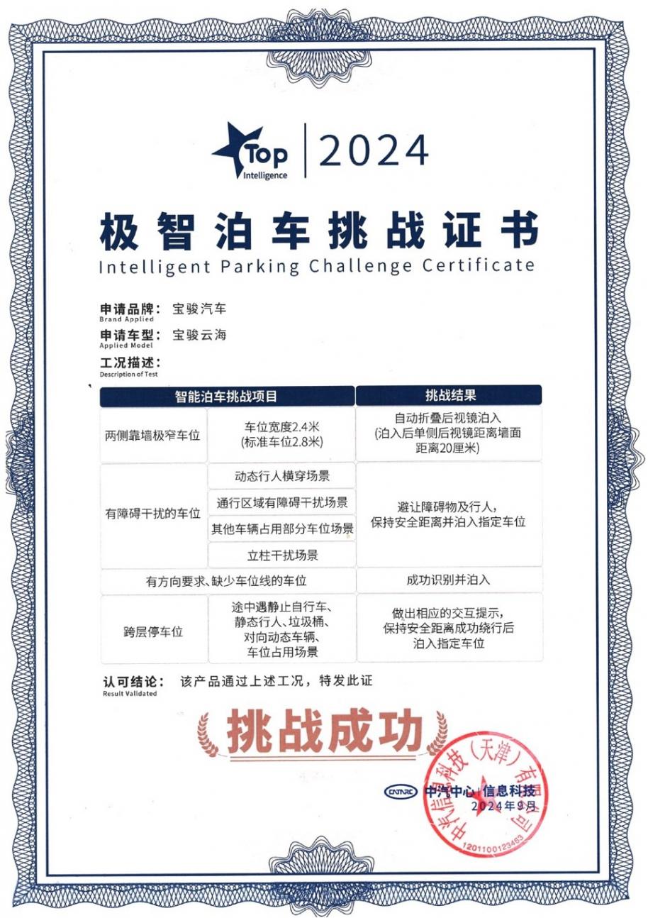 在智能泊車方面,寶駿云海通過(guò)靈眸智駕2.0 Max,能支持超3000種車位場(chǎng)景、任意角度的智能泊車,并且還擁有30s高效泊車、AI智慧出庫(kù)等先進(jìn)功能。此外通過(guò)同級(jí)唯一的記憶泊車、循跡倒車功能,寶駿云海還具有非常好用的代客泊車功能,這樣一來(lái)在公司、家里、商場(chǎng)這種經(jīng)常使用的停車場(chǎng)景,在記憶一次路線后,后續(xù)進(jìn)入泊車路線時(shí),它就會(huì)主動(dòng)推薦使用,來(lái)幫你進(jìn)行代客泊車,給到好用、方便的泊車體驗(yàn)。因此,寶駿云海日前還?舉斬獲了“TOP Intelligence極智泊?/行車挑戰(zhàn)”雙證書,智能泊車實(shí)力達(dá)到了20萬(wàn)內(nèi)頂流水平。