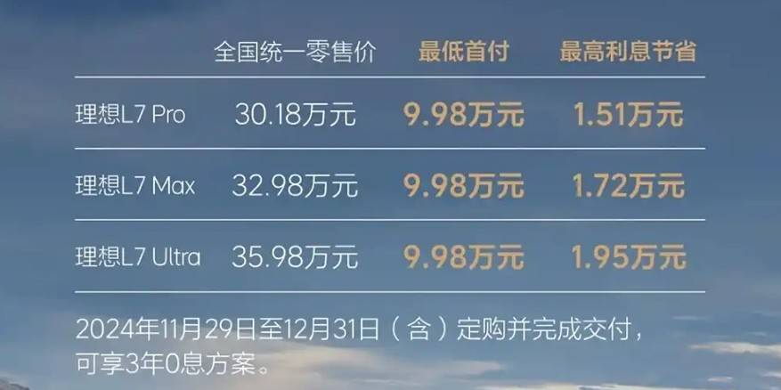 理想L7:指導價30.18萬元起,限時3年0息方案,最低首付9.98萬元,最高利息節省1.95萬元。