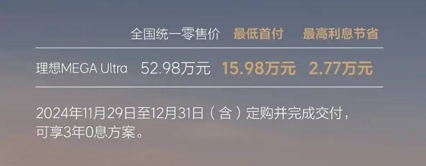 理想MEGA:指導價52.98萬元起,限時3年0息方案,最低首付15.98萬元,最高利息節省2.77萬元。