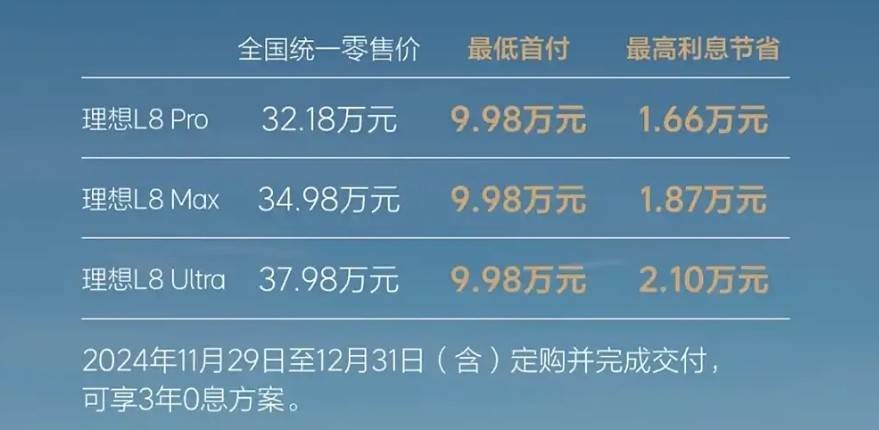 理想L8:指導價32.18萬元起,限時3年0息方案,最低首付9.98萬元,最高利息節省2.10萬元。