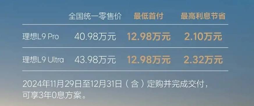 理想L9,指導價40.98萬元起,限時3年0息方案,最低首付12.98萬元,最高利息節省2.32萬元。