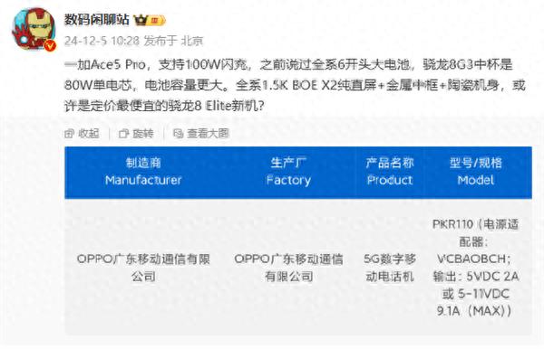 目前,一加Ace 5 Pro已經入網,入網信息顯示,新機支持100W快充。