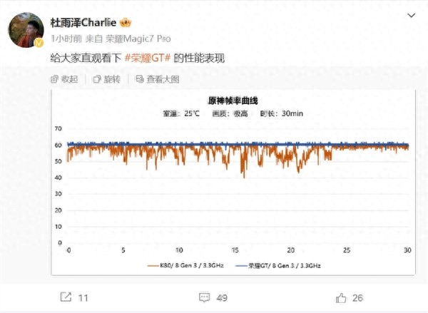 12月4日,耐不住網(wǎng)友催更,榮耀GT系列產(chǎn)品經(jīng)理@杜雨澤Charlie 發(fā)微博曬出一張原神幀率曲線圖,首次直觀展示了榮耀GT的性能表現(xiàn)。