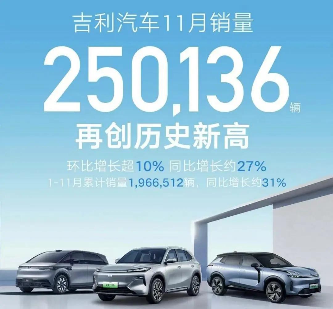 11月吉利銷量超過25萬,1-11月累計銷量接近197萬,此前吉利給自己定下的全年銷量目標是200萬,目前進度條已經完成98.3%。