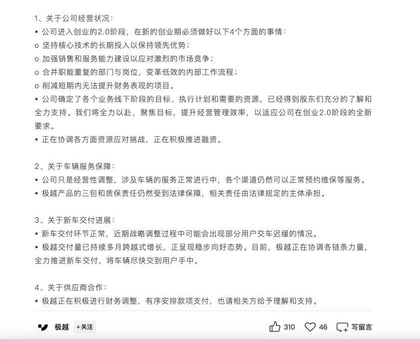 此外,在供應商合作上,極越正在積極進行財務(wù)調(diào)整,有序安排款項支付,也請相關(guān)方給予理解和支持。