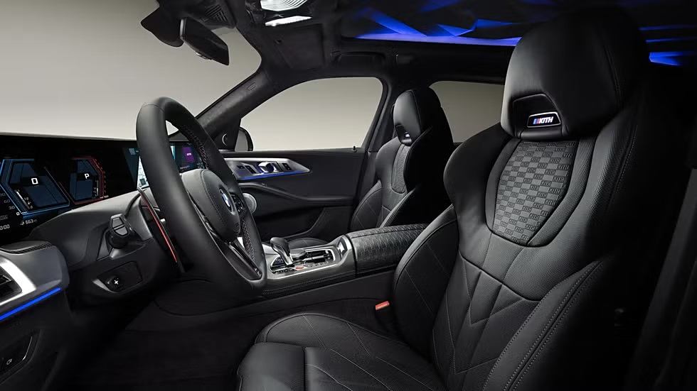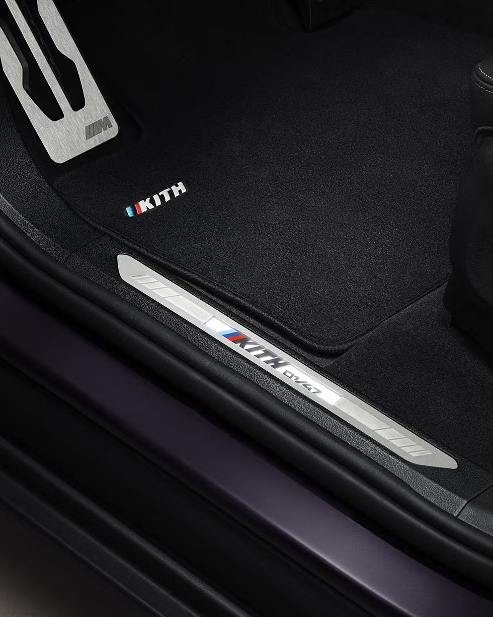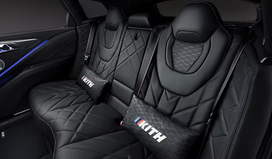 內飾方面,新車則采用了黑色的Merino皮革,而中央扶手、座椅等細節處還采用了馬賽克格子紋理工藝,同時,前排座椅頭枕、后排靠枕、迎賓踏板、腳墊以及換擋桿等,還配備了專屬的Kith標志。