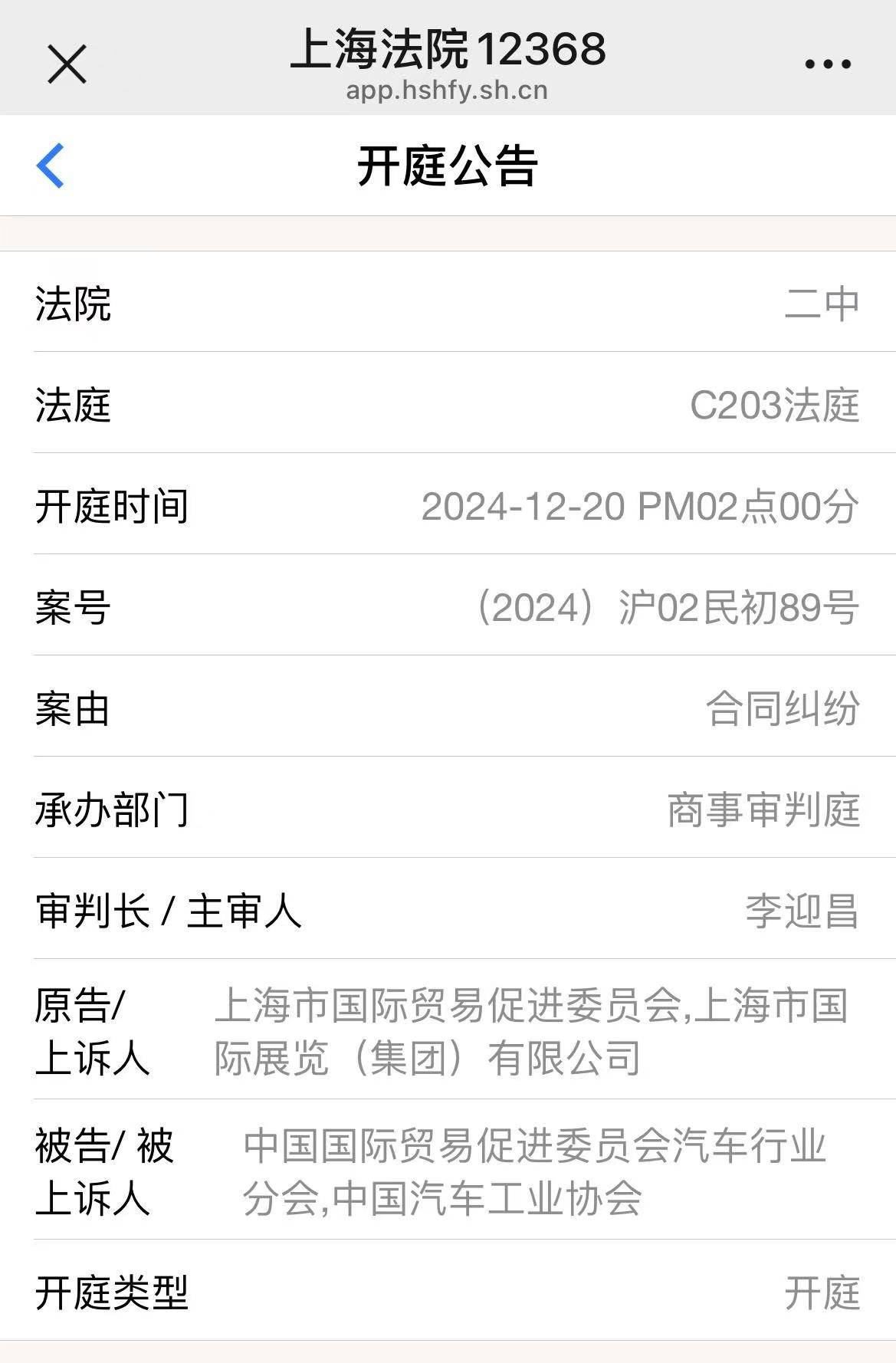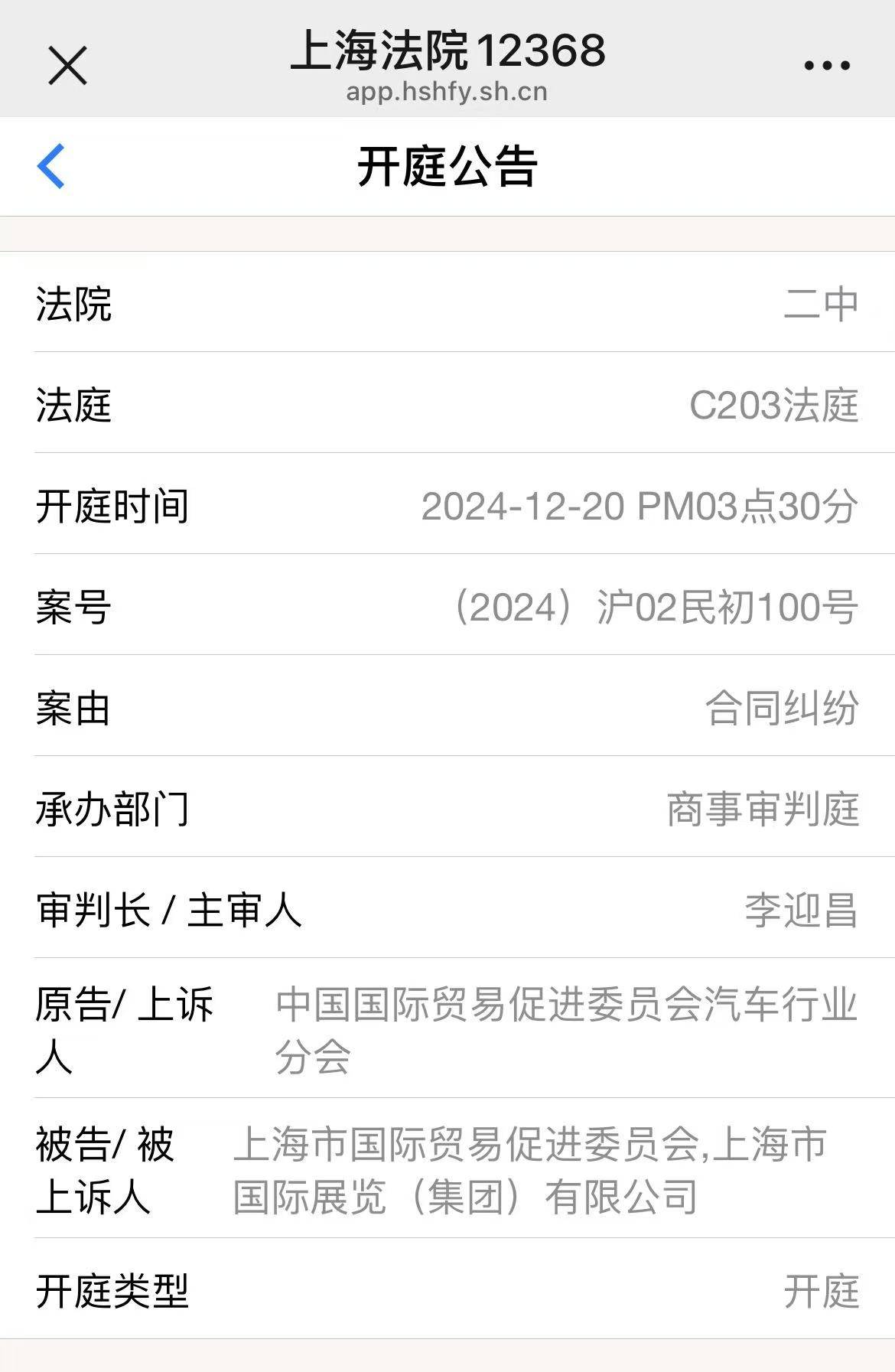 上海法院12368官方平臺顯示,上述兩家機構相關糾紛涉及兩場開庭,一場的原告方是中國國際貿易促進委員會汽車行業分會,被告方為上海市國際貿易促進委員會和上海市國際展覽(集團)有限公司。另一場的原告為上海市國際貿易促進委員會和上海市國際展覽(集團)有限公司,被告方是中國國際貿易促進委員會汽車行業分會和中國汽車工業協會。兩場開庭的案由均為合同糾紛。
