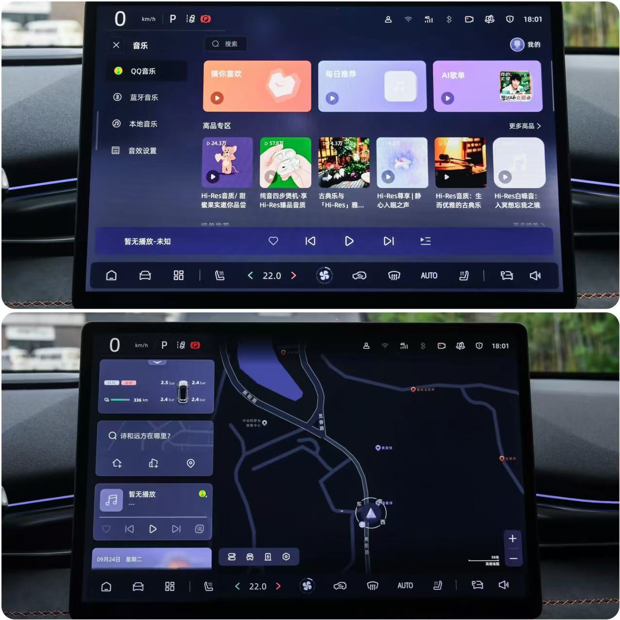 我們來看看車機功能,這臺車配備了一塊屏幕,是15.4英寸的中控屏幕,內置Deepal OS系統和高通驍龍8155芯片,這塊屏幕的畫質比較清晰,沒有那種隱約的情況,因為屏幕分辨率為2.5K,長方形樣式布局擁有邏輯性,找功能的時候挺簡單的,這塊屏幕包含了儀表盤功能,在屏幕的左邊顯示車速、擋位等,如果想要看到更詳細的信息,可以打開車輛設置查看,打開在線導航,我們輸入目的地以后擴展到全屏幕顯示,然后用手指快速拖動了一下反應還是比較流暢的,在導航界面也可以將常用的功能放在屏幕左邊,比如歌曲播放、時間、車輛胎壓顯示等信息,不用退出導航查看,互不影響。