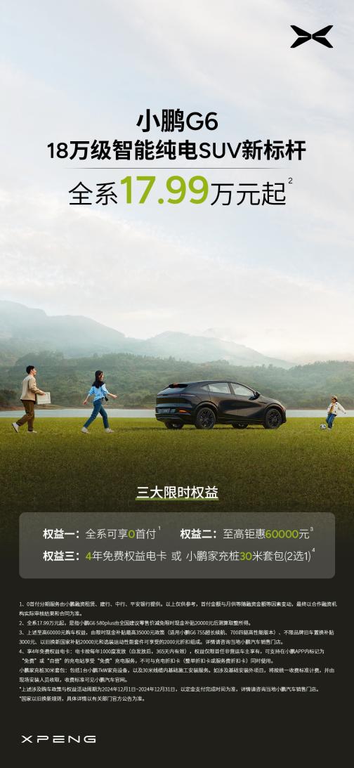 小鵬G6拿出了17.99萬起售,0首付至高鉅惠60000元的政策,相當(dāng)于19.99萬就能買到755km續(xù)航+800V+高階智駕的小鵬G6,是20萬以內(nèi)唯一能做到這個配置水平的車型,并且不用等車,當(dāng)天直接提車開回家。