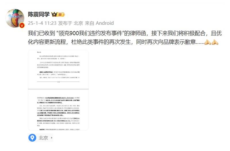 2025年1月4日,陳震通過個人微博稱:我們已收到“領克900我們違約發布事件”的律師函,接下來我們將積極配合,且優化內容更新流程,杜絕此類事件的再次發生,同時再次向品牌表示歉意……