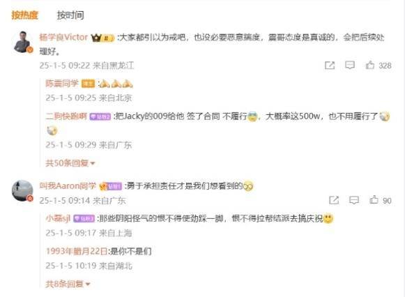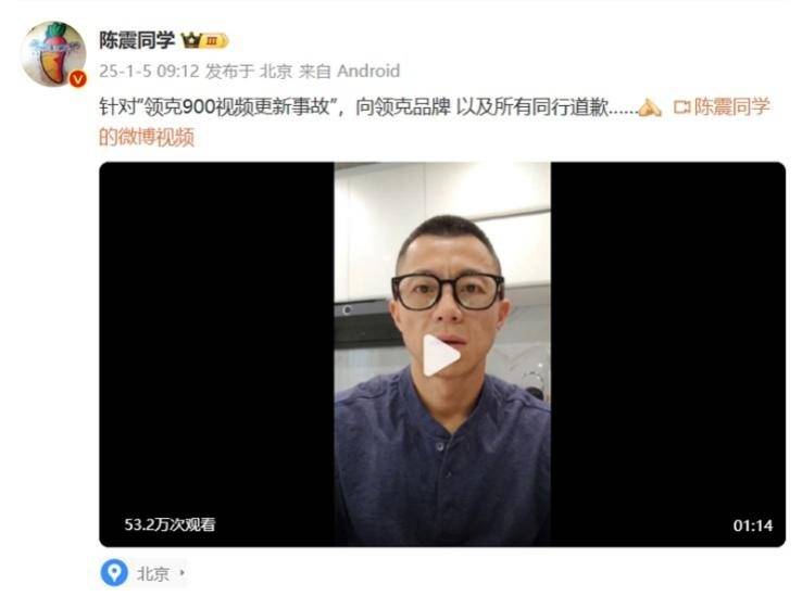 2025年1月5日,陳震通過個人微博發布道歉視頻,向領克品牌以及所有同行道歉。在該道歉視頻的評論中,吉利集團高級副總裁楊學良表示:大家都引以為戒吧,也沒必要惡意揣度,震哥態度是真誠的,會把后續處理好。