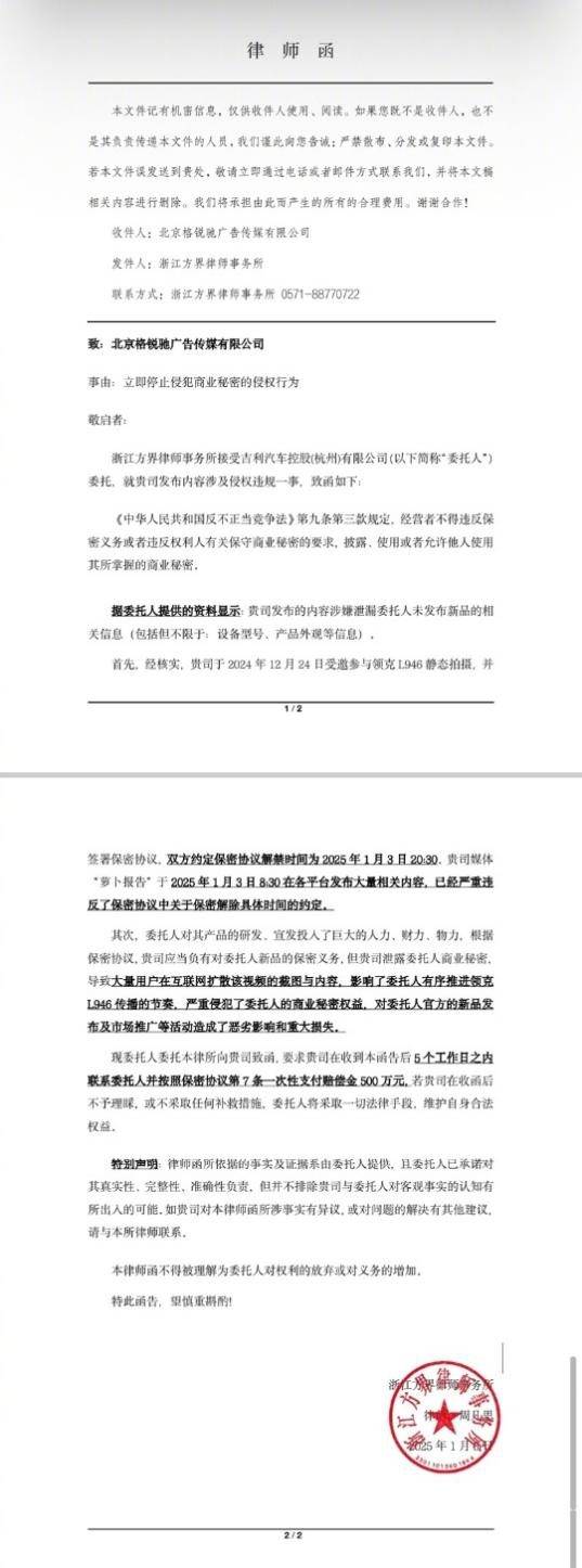 2025年1月3日早上8:30,陳震公司的媒體賬號“蘿卜報告”在各大平臺發布了大量領克900靜態拍攝的相關內容,這一行為很顯然違反了當初簽訂的保密協議。