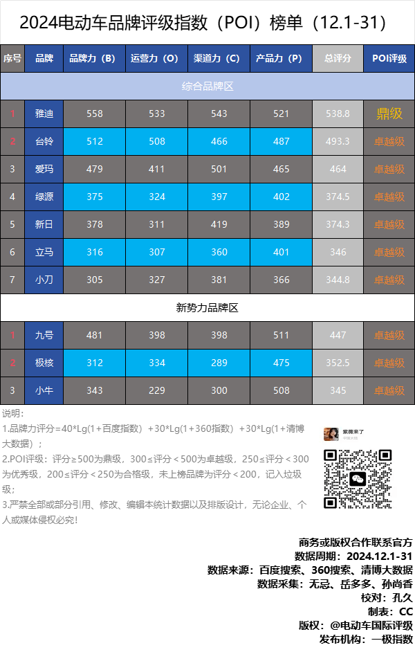 12月份(12.1-12.31)沖擊新年市場全行業(yè)持續(xù)發(fā)力,品牌指數(shù)排名基本保持穩(wěn)定,雅迪以絕對實力領跑榜單第一,遙遙領先;臺鈴維持高頻曝光,繼續(xù)保持第二;愛瑪?shù)奶厥馐录庼脖M管仍未掃去,但事件影響下降,品牌回升至第三。