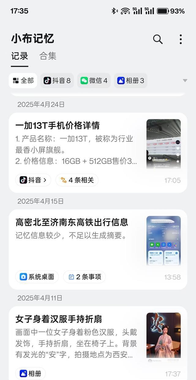 剛才說了,這個功能是通過按鍵來用的,但是如果你的手機沒有這個按鍵怎么辦呢?別擔心,你可以用三個手指一起往上滑來開啟這個功能。三個手指往下滑是截屏,往上滑是小布記憶,也挺方便的。