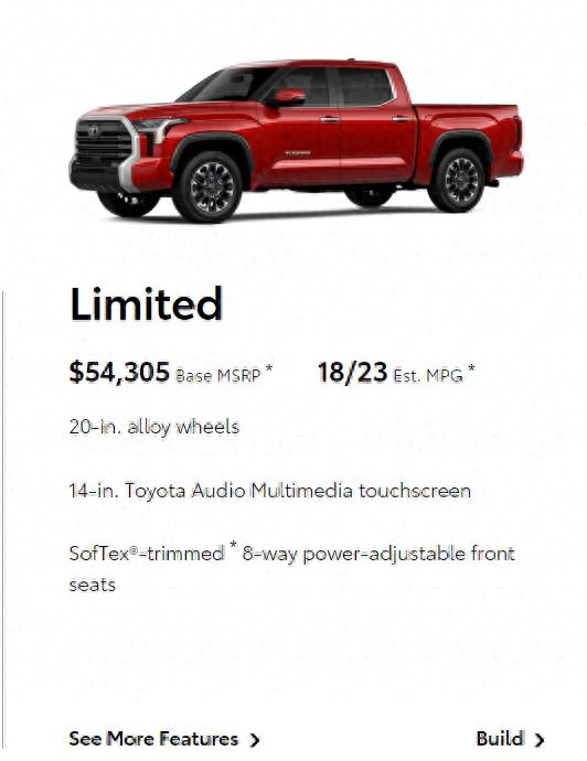 動力部分,豐田坦途Limited將搭載i-FORCE 3.5T V6雙渦輪增壓發動機,最大功率達到了389馬力,傳動系統為10速自動變速箱,該版本還提供TRD越野套裝可以選擇,具體參數和信息,還以官方正式公布為準。