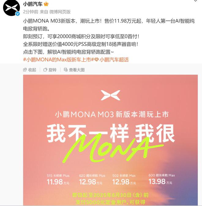 5月28日,小鵬MONA M03 Max正式上市,根據續航分為兩個版本,其中續航502km的版本售價為12.98萬元,600km續航的版本售價為13.98萬元。小鵬MONA M03新版本,潮玩上市,售價11.98萬元起。