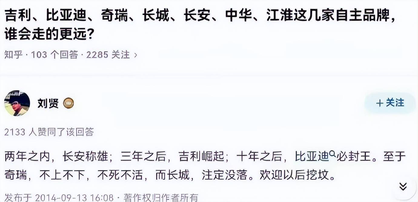 看到這位網友11年前的預測,讓我們不得不懷疑,是不是真的有穿越者的存在,他在11年前穿越到2024年—2025年這個時間節點,看到了自主品牌的現狀,然后回答了這個問題。因為總體上來說,他的這個回答屬于準得離譜的類型,對于很多品牌的預測都非常到位。