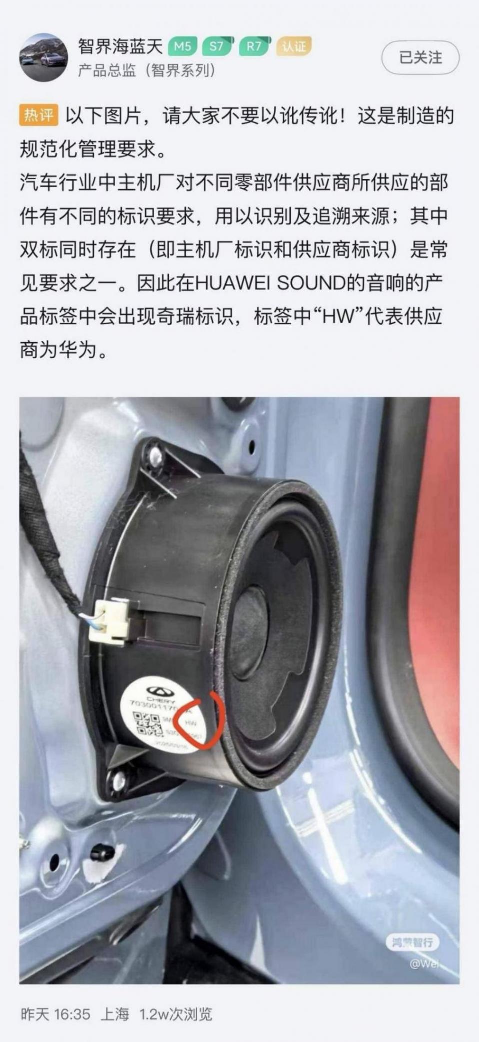 6月18日,一張HUAWEI SOUND音響產品標簽的照片在汽車圈引發關注。標簽上同時出現的奇瑞標識和“HW”字樣,引起了行業和部分用戶的關注或者疑惑。系列產品總監海藍天當天迅速通過社交媒體平臺發聲,明確表示:“請大家不要以訛傳訛!這是制造的規范化管理要求。”