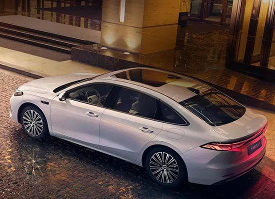 車身側面,修長的車身配合溜背式設計,營造出優雅而動感的車身姿態,配合19英寸“刀鋒”輪轂和熏黑側裙,進一步強化了車輛的運動屬性,雖然是新能源車型,但新車依舊采用傳統機械門把手,在實際用車場景下,機械結構可靠性更高。