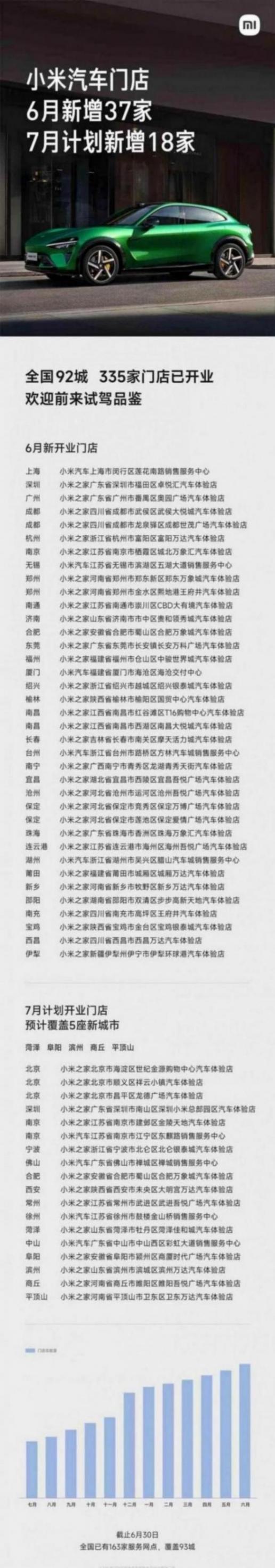 本月新開業的小米汽車門店遍布上海、深圳、廣州等多個城市,而7月計劃開業的門店預計將覆蓋菏澤、阜陽、濱州、商丘、平頂山等5座城市。截至目前,小米汽車的服務網點已達到163家,覆蓋全國93個城市,顯示出小米汽車在全國范圍內快速擴張的勢頭。