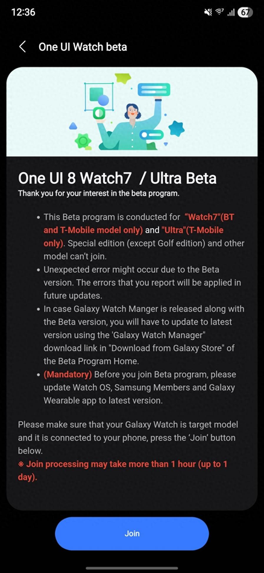 據IT之家了解,韓國和美國用戶可以通過 Samsung Members 應用報名加入測試計劃,打開應用后點擊橫幅即可注冊參與,然后再通過 Galaxy Wearable 應用下載安裝最新測試固件。