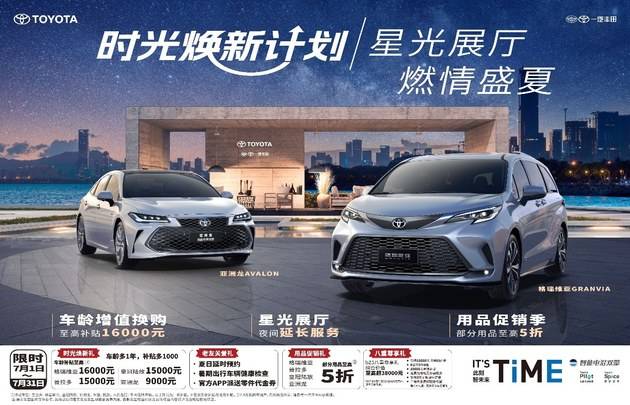進入7月促銷關鍵期,“時光煥新計劃”全面升級加碼,通過精準、有力且極具誘惑力的舉措引爆市場。車齡增值換購,至高補貼16000元;星光展廳夜間延長服務,避開酷暑輕松看車,購車更從容;格瑞維亞、普拉多、皇冠陸放、亞洲龍部分用品至高5折;購買bZ5還可享價值10000元的金融自由艙、0首付3年0息、置換補貼10000元、免費充電樁及安裝服務等八重尊享禮,綜合價值至高超38000元;更有豐厚的老友關愛禮,讓盛夏駕享更省心。