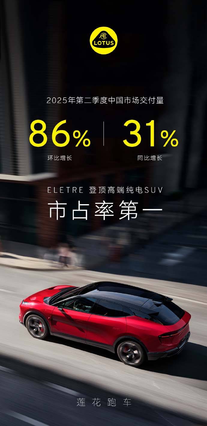 7月2日,蓮花跑車發布最新銷售數據顯示,2025年第二季度中國市場交付量環比激增86%、同比增長31%,增速表現亮眼。其主力車型ELETRE在高端純電SUV市場中,以領先優勢拿下市場占有率第一。