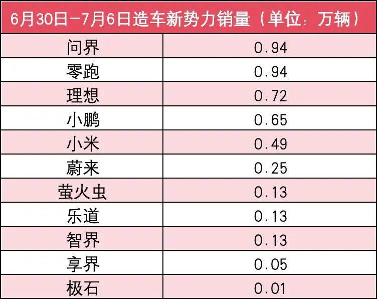 經(jīng)過二季度末的沖刺,在7月第一周,造車新勢力銷量幾乎全員環(huán)比下滑。這也是意料之中的事情。其中,小鵬和小米兩家銷量環(huán)比波動最大,銷量減少約4500輛,僅有螢火蟲和極石兩家保持了環(huán)比正增長。