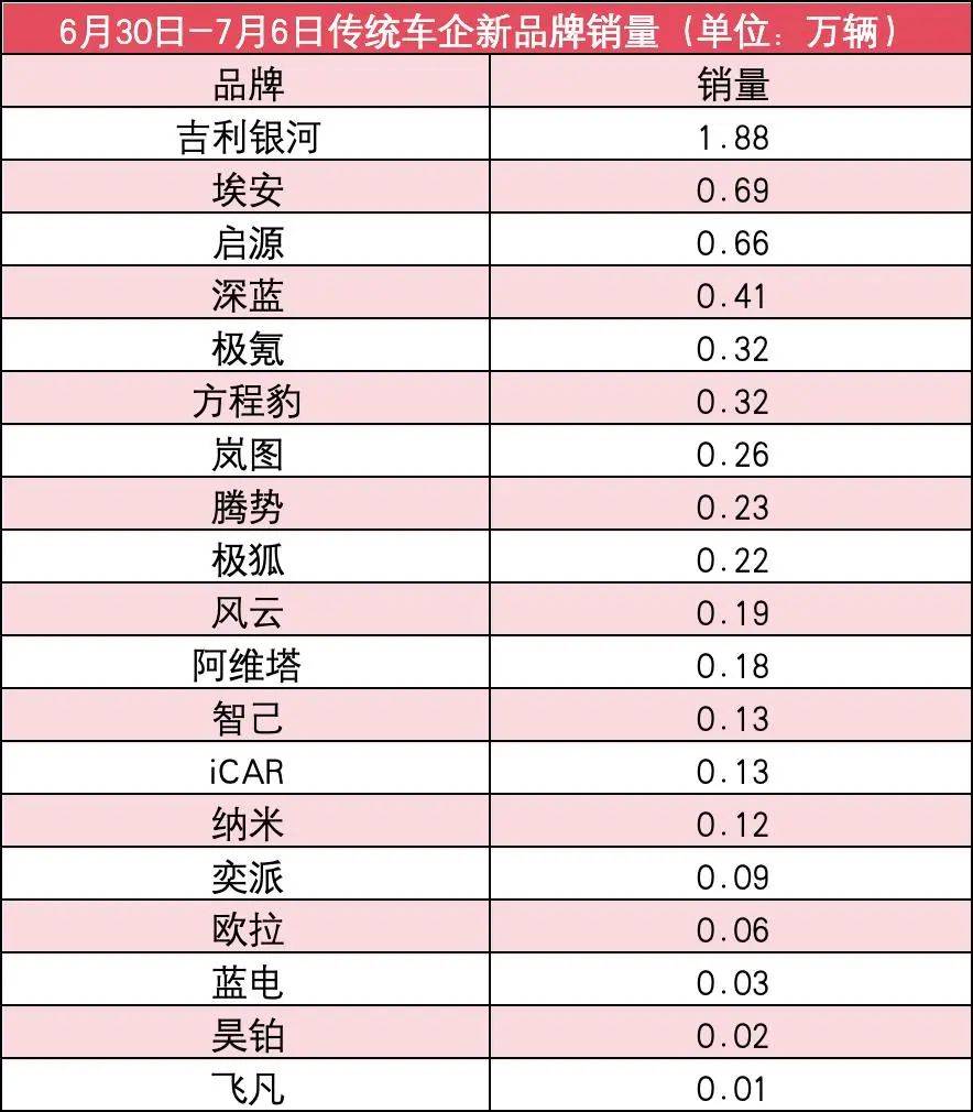 而在傳統(tǒng)車企新品牌方面,上周銷量也基本上是下滑。其中,吉利銀河長期穩(wěn)居第一,上周銷量為1.88萬輛,較前一周下滑了0.6萬輛;這也是傳統(tǒng)車企新品牌中唯一周銷量過萬的。埃安為0.69萬輛,較前一周下滑了0.04萬輛;緊隨其后的是啟源,其銷量為0.66萬輛,較前一周下滑了0.29萬輛。