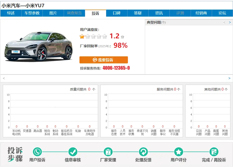 或許受到交付問題影響,小米YU7在車質(zhì)網(wǎng)上的用戶滿意度只有1.2分(5分制)。